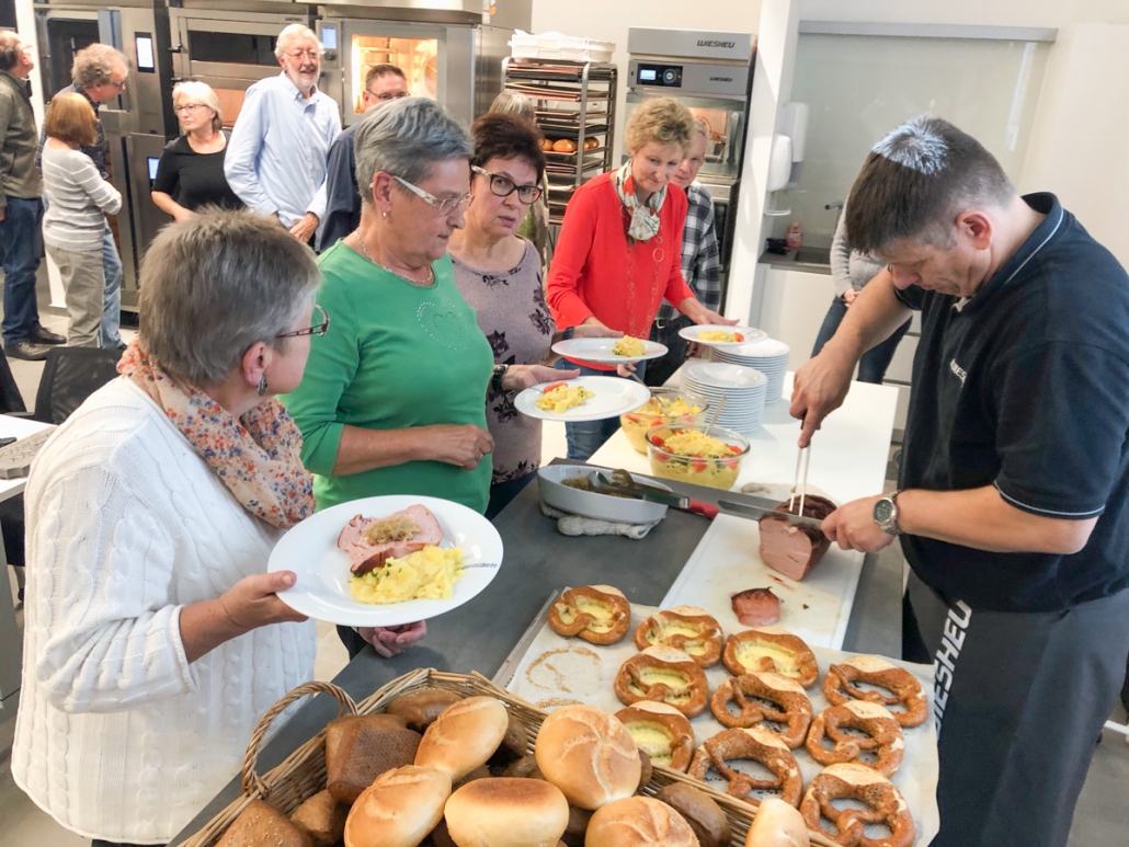 Der dritte Teil des Nachmittags fand wieder im Seminarraum statt, wo Herr Rieber mehr über die verschiedenen Backofenkombinationen und deren Anwendungsmöglichkeiten erzählte. Nebenbei wurden live Brezeln und Brötchen gebacken. Und zum Abschluss wurden die Gäste noch mit hausgemachtem Kartoffelsalat (echt lecker) und Fleischkäse aus dem Wiesheu-Ofen verwöhnt.